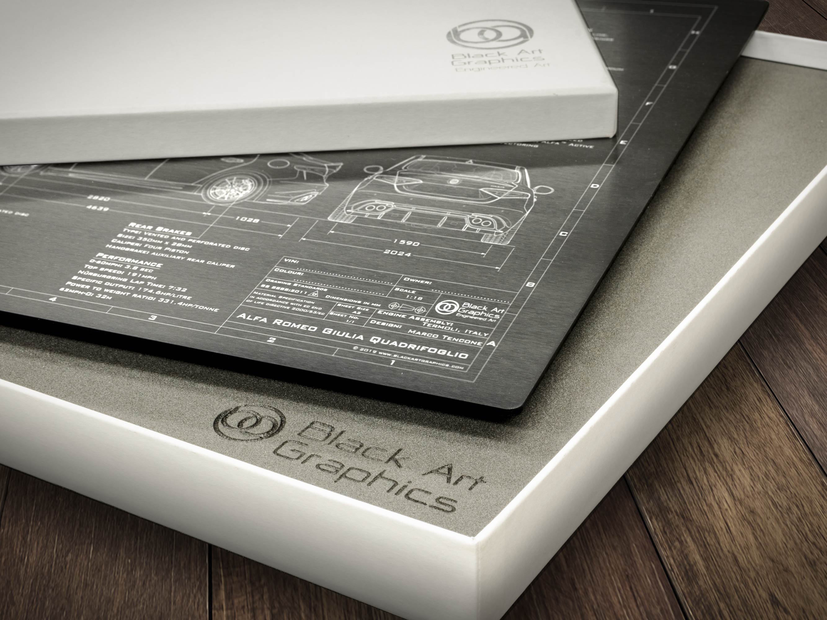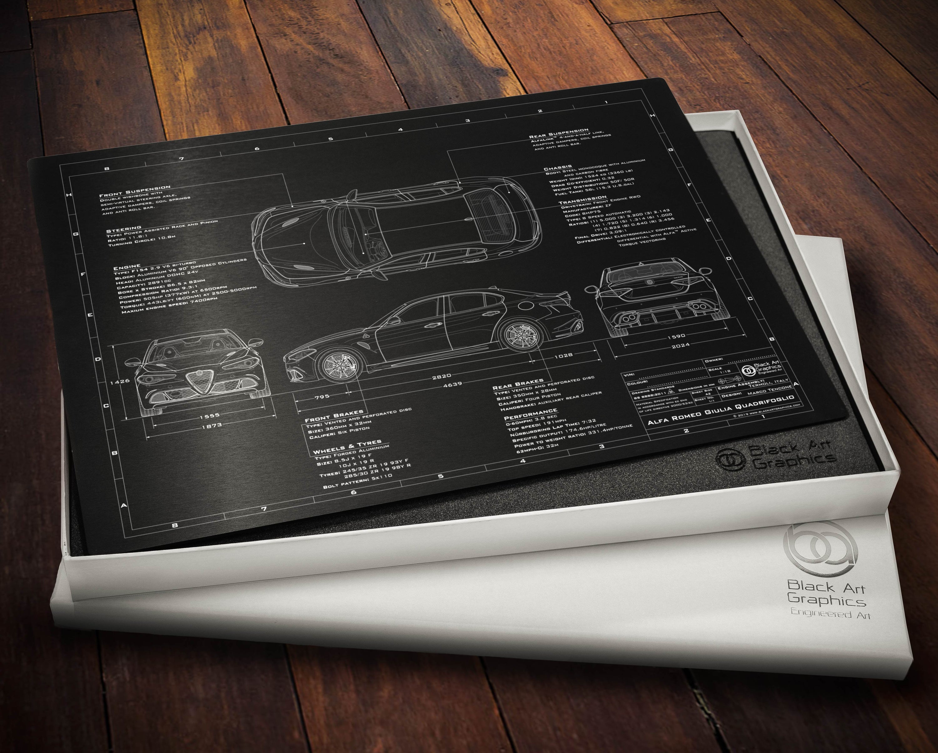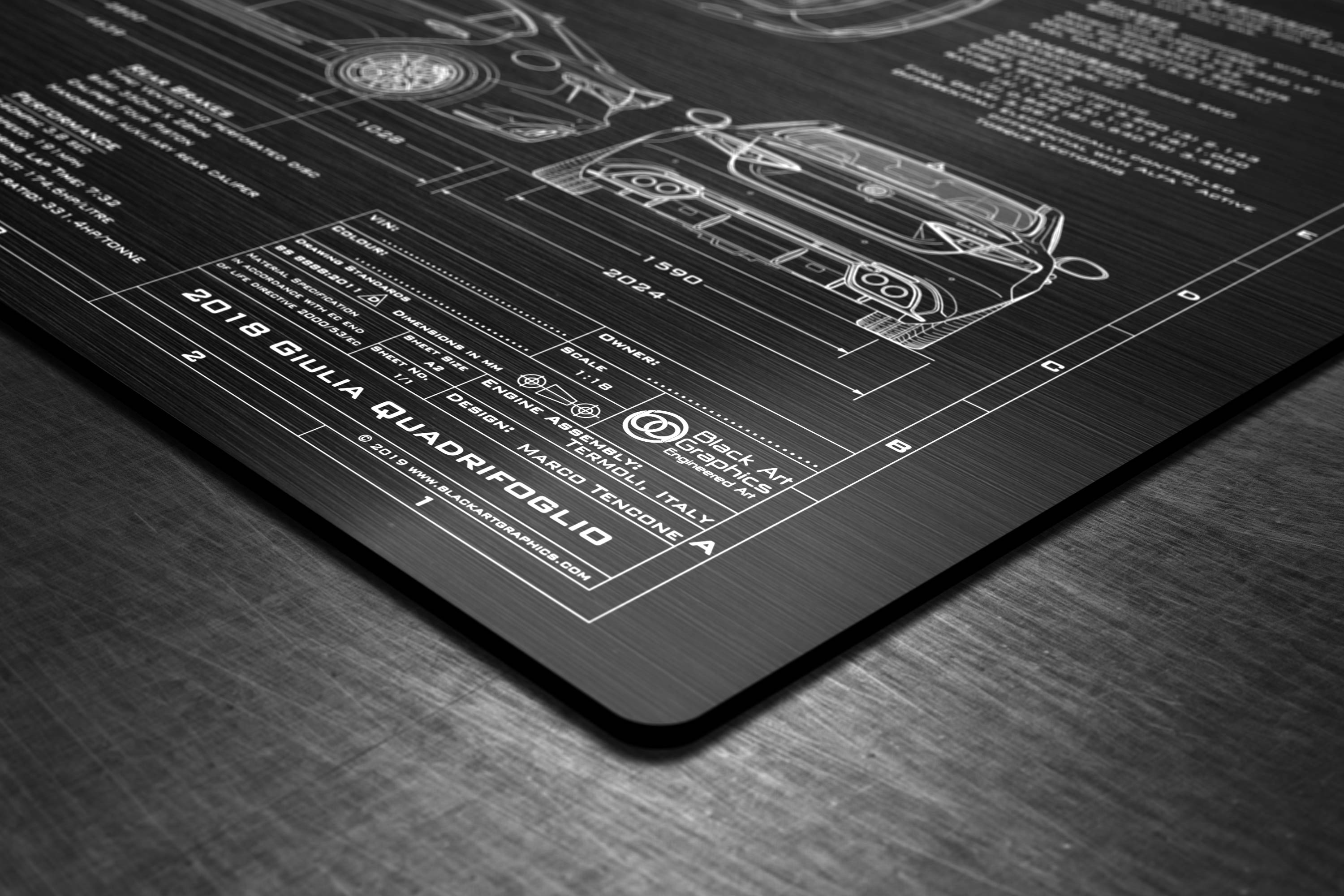 Whether you are looking for the perfect gift for a loved one, or simply a unique piece of art to commemorate your Giulia Quadrifoglio ownership, our 2016-2019 Alfa Romeo Giulia Quadrifoglio 'Engineered Art' plaque is the perfect solution.