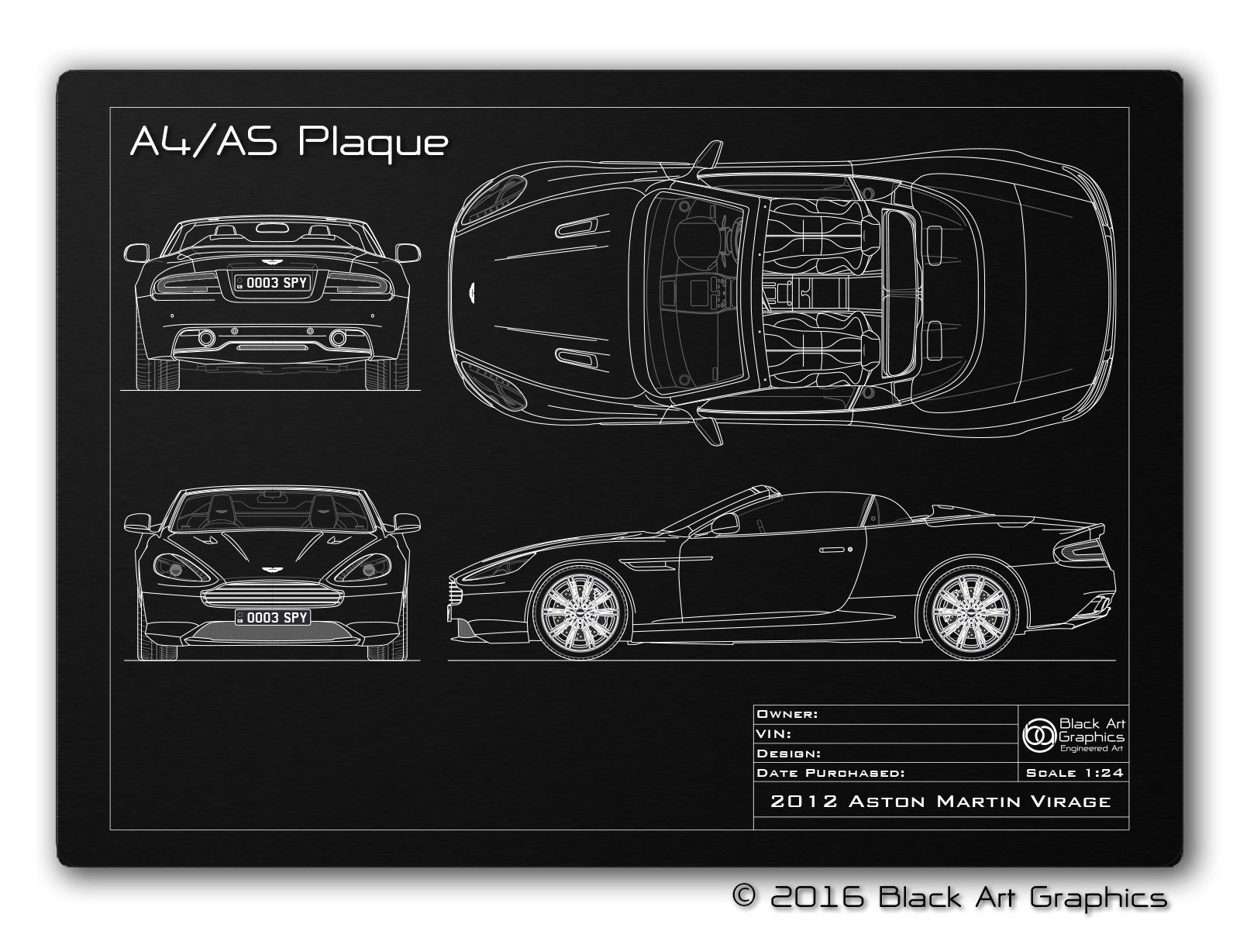 A detailed orthographic drawing and technical specification of the Aston Martin Virage, laser etched on our standard issue brushed & black anodised aluminium plaque and supplied with a mounting kit for frameless hanging. Coupe and Volante versions available.
