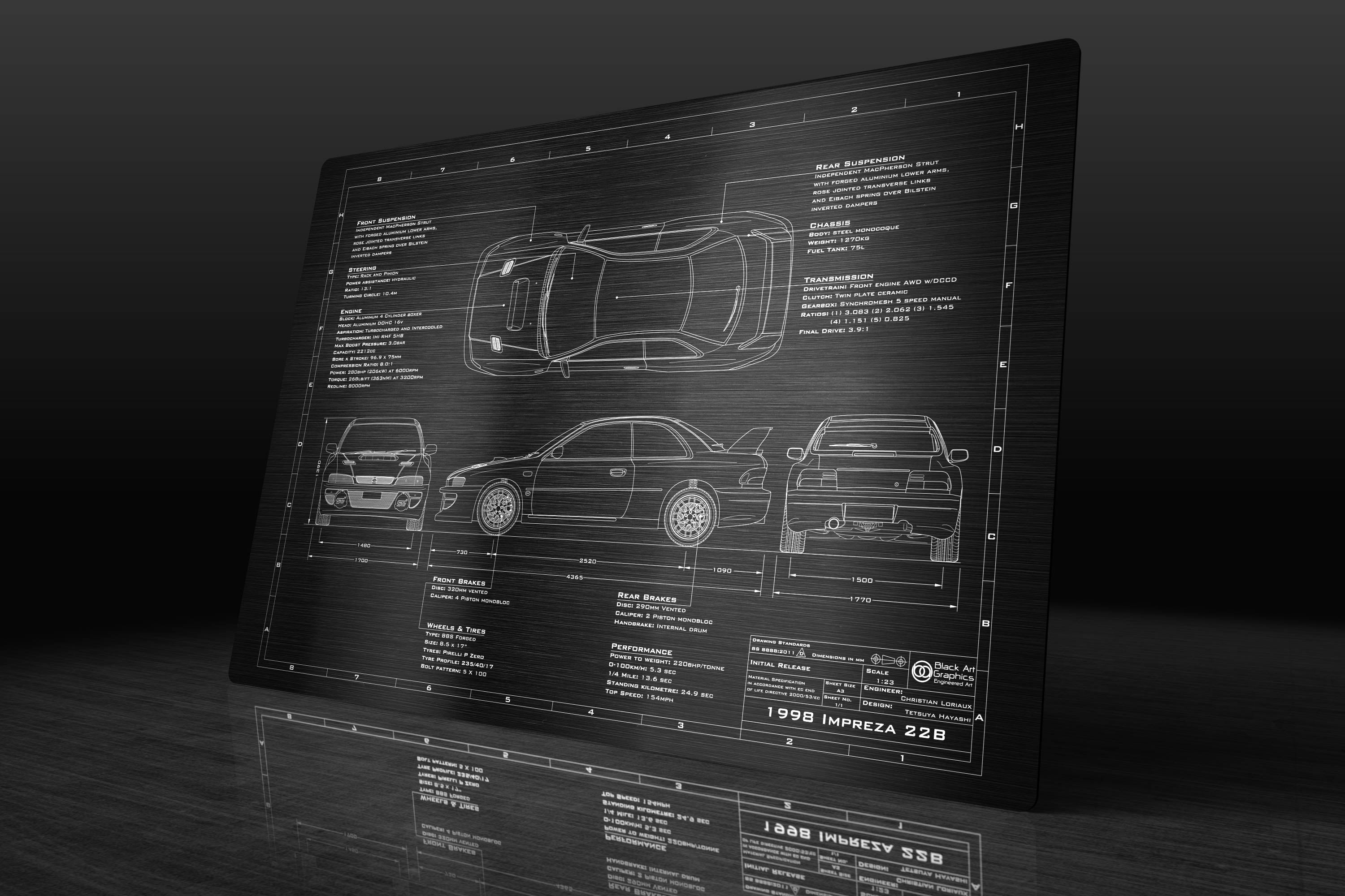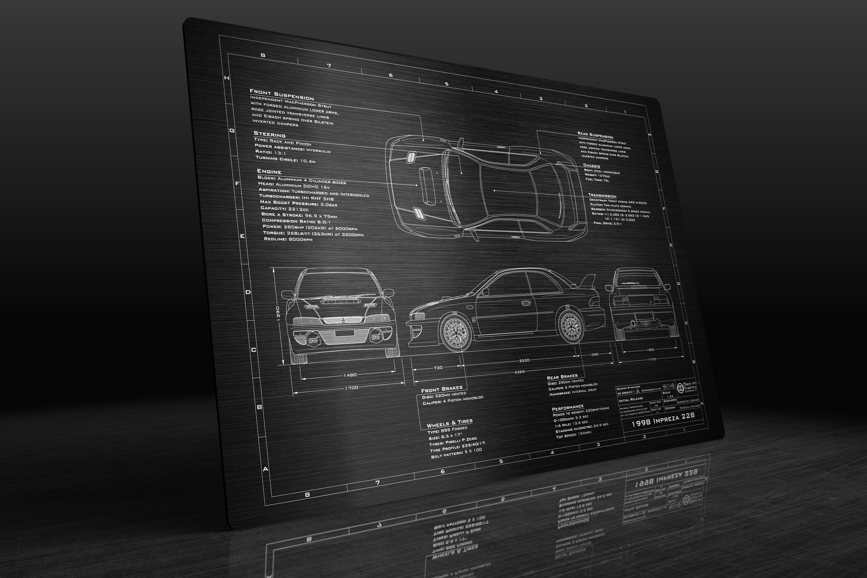 Whether you are looking for the perfect gift for a loved one, or simply a unique piece of art to commemorate your Impreza 22B ownership, our 1998-1999 Subaru Impreza 22B 'Engineered Art' plaque is the perfect solution.